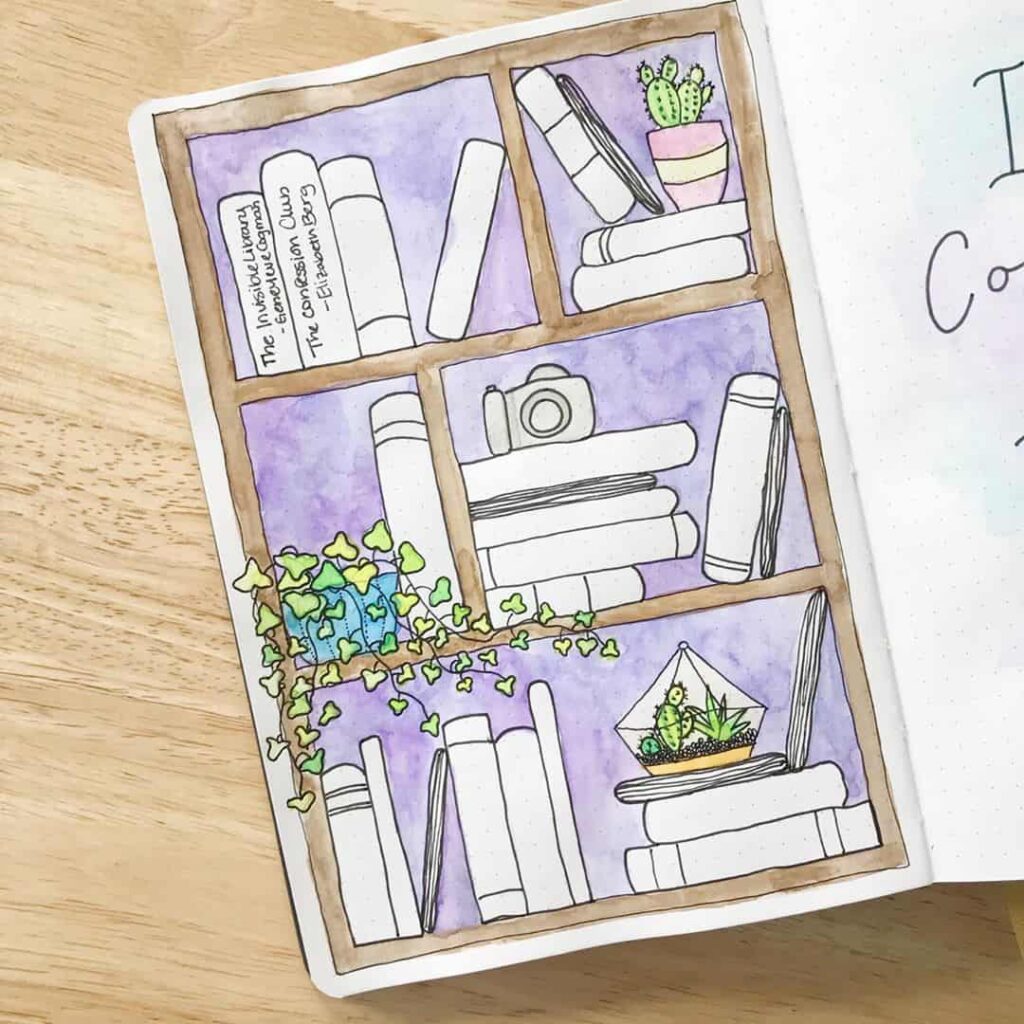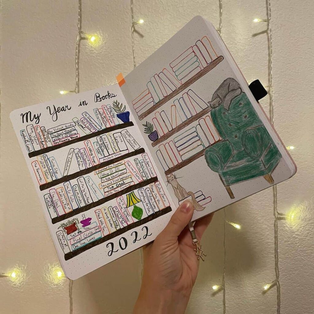 No book lover’s bullet journal is complete without a charming bookshelf spread. This creative canvas allows you to showcase the covers of your recently read or upcoming books, each carefully illustrated or adorned with washi tape. It’s a delightful visual representation of your literary adventures that adds a touch of whimsy to your journal.