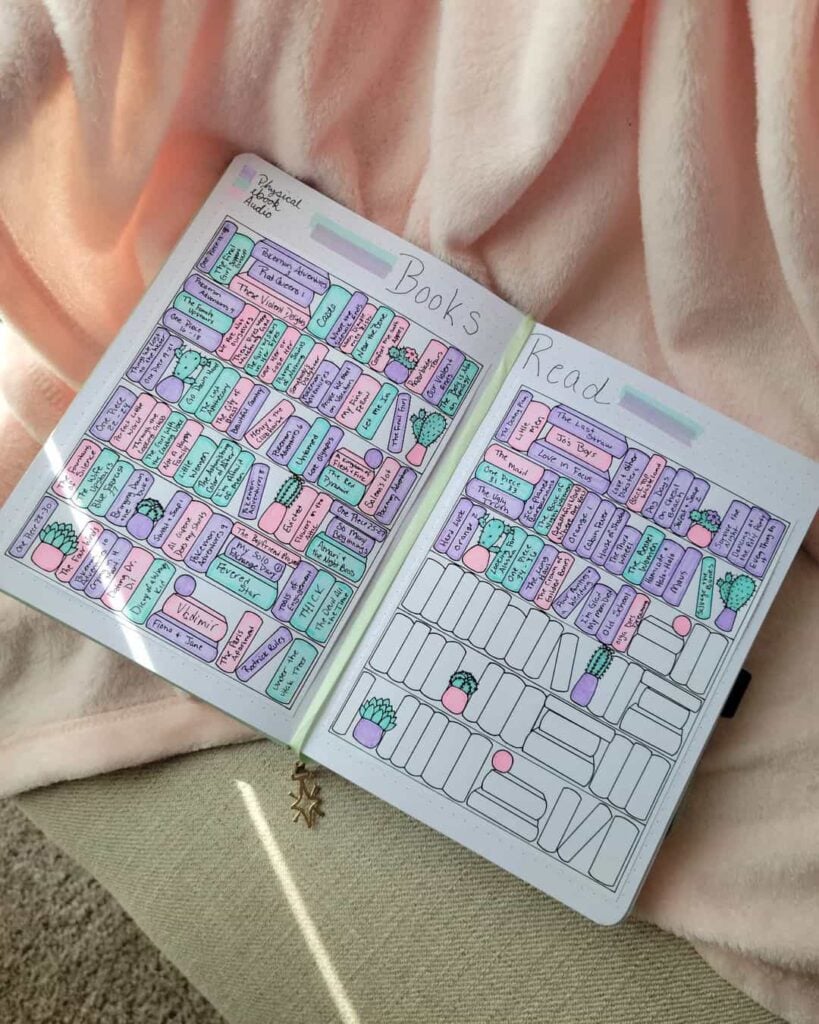 The bookshelf is such a popular option when drawing a bullet journal reading tracker! They come in all shapes and sizes and are such a fun way to show the spines of the books you are reading.